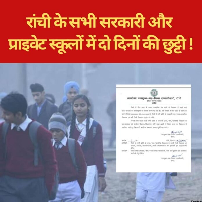 रांची के उपायुक्त मंजूनाथ भजंत्री द्वारा शनिवार को जारी आदेश में कहा गया है कि कड़ाके की सर्दी की वजह से विद्यार्थी परेशान हैं. रांची जिले में शीत लहर को देखते हुए अत्याधिक ठंड पड़ने से विद्यालय में पढ़ने वाले छात्र-छात्राओं को कठिनाइयों का सामना करना पड़ रहा है. वैसी स्थिति में शीत लहर के प्रकोप के कारण छह जनवरी एवं सात जनवरी को रांची जिले के सभी कोटि के सरकारी उच्च/मध्य/प्राथमिक विद्यालय एवं सभी प्राइवेट स्कूल पूरी तरह बंद रहेंगे.