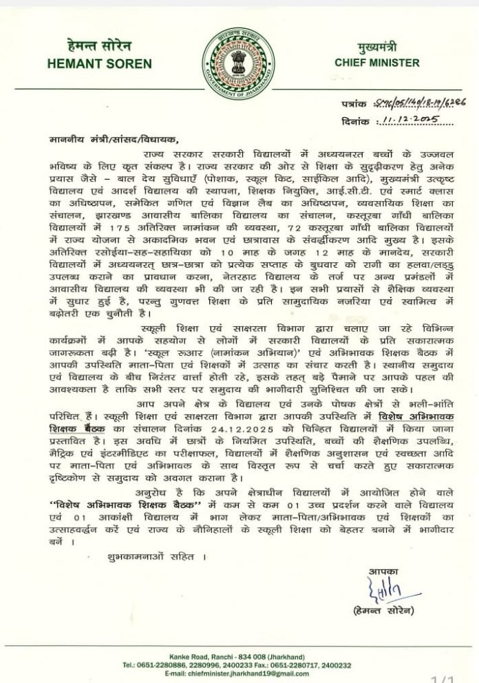 मुख्यमंत्री द्वारा लिखे गए पत्र में जनप्रतिनिधियों से आग्रह करते हुए कहा गया है कि आप अपने क्षेत्र के विद्यालय एवं उनके पोषक क्षेत्रों से भली-भांति परिचित हैं. स्कूली शिक्षा एवं साक्षरता विभाग द्वारा आपकी उपस्थिति में विशेष अभिभावक शिक्षक बैठक का संचालन दिनांक 24.12.2025 को चिन्हित विद्यालयों में किया जाना प्रस्तावित है.