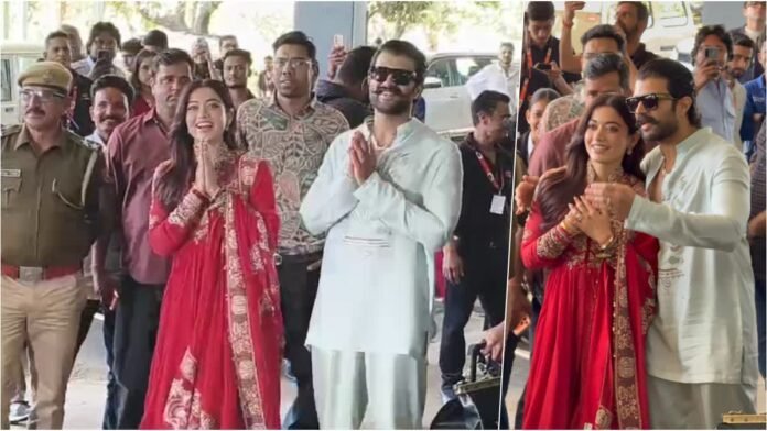 उदयपुरः अरावली की खूबसूरत वादियों के बीच बसे उदयपुर में शाही शादी के बाद साउथ फिल्म इंडस्ट्री के चर्चित कपल रश्मिका मंदाना और विजय देवरकोंडा शुक्रवार को पहली बार मीडिया के सामने आए. नव विवाहित जोड़ा शुक्रवार को महाराणा प्रताप एयरपोर्ट (डबोक एयरपोर्ट) पहुंचा, जहां फैंस ने उनका गर्मजोशी से स्वागत किया.