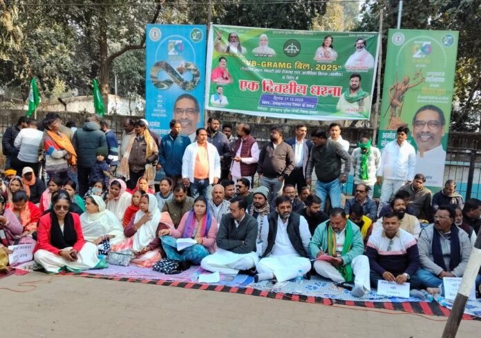 Deoghar : मनरेगा का नाम बदलकर जीबी जी राम जी किए जाने के विरोध में देवघर में झामुमो के नेताओं व कार्यकर्ताओं ने शनिवार धरना दिया. समाहरणालय के समक्ष धरना पर बैठे झामुमो नेताओं ने केंद्र सरकार से जीबी जी राम जी बिल को रद्द कर फिर से मनरेगा करने की मांग की. जिलाध्यक्ष संजय शर्मा ने कहा कि केंद्र सरकार ने बिना देश को बताए व बिना पूर्व चर्चा के गुपचुप तरीके से बिल को पास करवा लिया. मनरेगा का नाम बदलकर जीबी जी राम जी करने के पीछे केंद्र सरकार की मंशा महात्मा गांधी के नाम को हटाने की है. धरना में बड़ी संख्या में झामुमो के नेता व कार्यकर्ता शामिल थे.