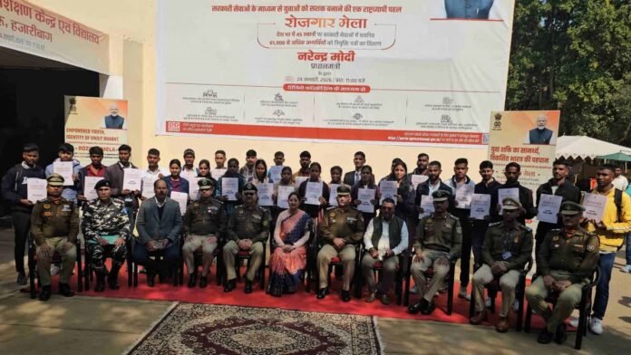 पीएम ने दिया नागरिक देवो भवः का मंत्रप्रधानमंत्री ने अभ्यर्थियों से “नागरिक देवो भव:” की भावना से देश की सेवा करने की अपील की. उन्होंने कहा कि दुनिया में भारत एक युवा देश में से एक है. युवाओं को रोजगार से जोड़ने के लिए सरकार कई स्तर पर काम कर रही है. दुनिया का भरोसा भारत पर बढ़ा है. देश की अर्थव्यवस्था सुदृढ़ हो रही है. 2047 तक भारत विकसित देशों की सूची में शामिल होगा.हजारीबाग में 223 अभ्यर्थियों को मिला नियुक्ति पत्रहजारीबाग में 463 अभ्यर्थियों में से 223 को नियुक्ति पत्र दिया गया. इसमें बीएसएफ के 184, सीआरपीएफ के 14, एसएसबी के 7, आईटीबीपी के 7 और असम राइफल के 11 सफल अभ्यर्थी शामिल हैं. इस दौरान अभ्यर्थियों में गजब का उत्साह नजर आया.