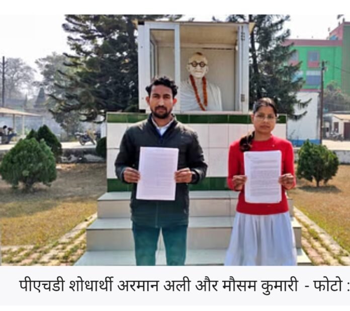 बीएन मंडल विश्वविद्यालय मधेपुरा में प्रशासन और छात्रों के बीच विवाद गहराता जा रहा है। दो पीएचडी शोधार्थियों अरमान अली और मौसम कुमारी ने राष्ट्रपति को पत्र लिखकर आत्मदाह की अनुमति मांगी है। दोनों छात्रों का आरोप है कि विश्वविद्यालय प्रशासन की तानाशाही और अन्यायपूर्ण नीतियों के कारण उन्हें मानसिक और शैक्षणिक प्रताड़ना झेलनी पड़ रही है। उन्होंने स्पष्ट किया कि यदि न्याय नहीं मिला तो वे 19 फरवरी को राज्यपाल के सामने आत्मदाह करेंगे।