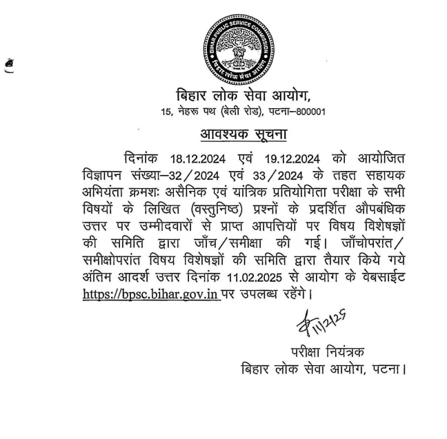 BPSC AE Final Answer Key: सहायक अभियंता भर्ती की अंतिम उत्तर कुंजी जारीबीपीएससी सहायक अभियंता भर्ती परीक्षा का आयोजन 18 और 19 दिसंबर, 2024 को किया गया था। आयोग ने उक्त परीक्षा की अनंतिम उत्तर कुंजी 21 जनवरी, 2025 को जारी की और उम्मीदवारों से आपत्तियां आमंत्रित की थीं। प्राप्त आपत्तियों की समीक्षा के बाद आयोग ने आज, 11 फरवरी को अंतिम उत्तर कुंजी भी प्रकाशित कर दी है।